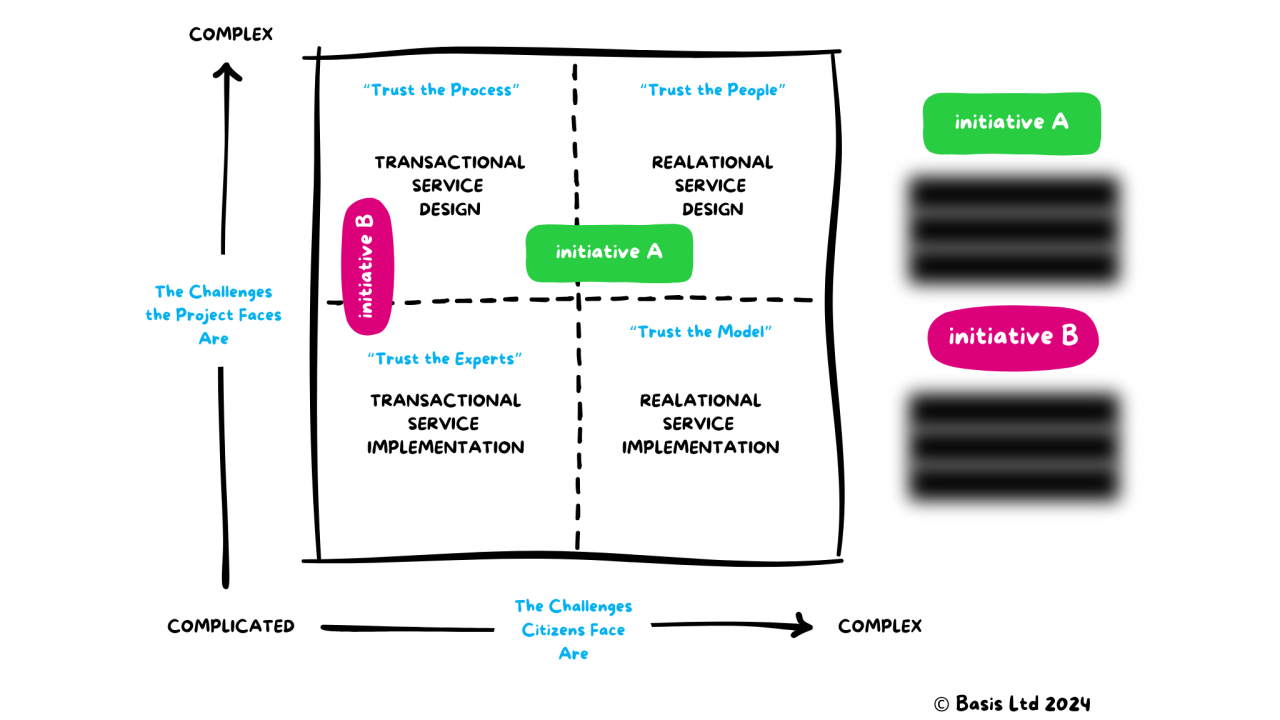 The first step is to map your initiatives against a version of Stacey’s matrix. We’ve adapted the language over time for our context in public services and are currently using the version below.